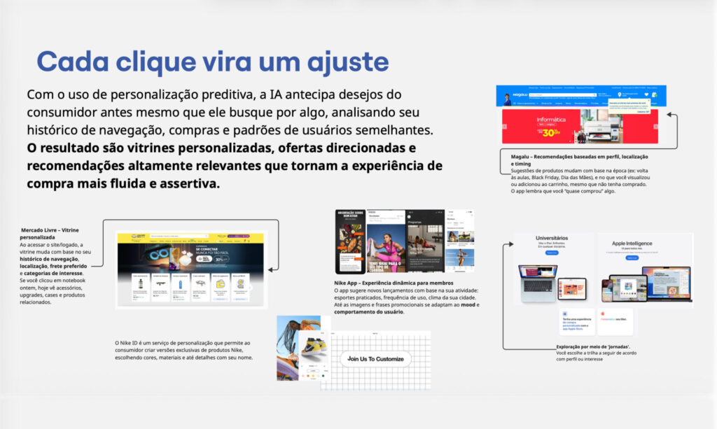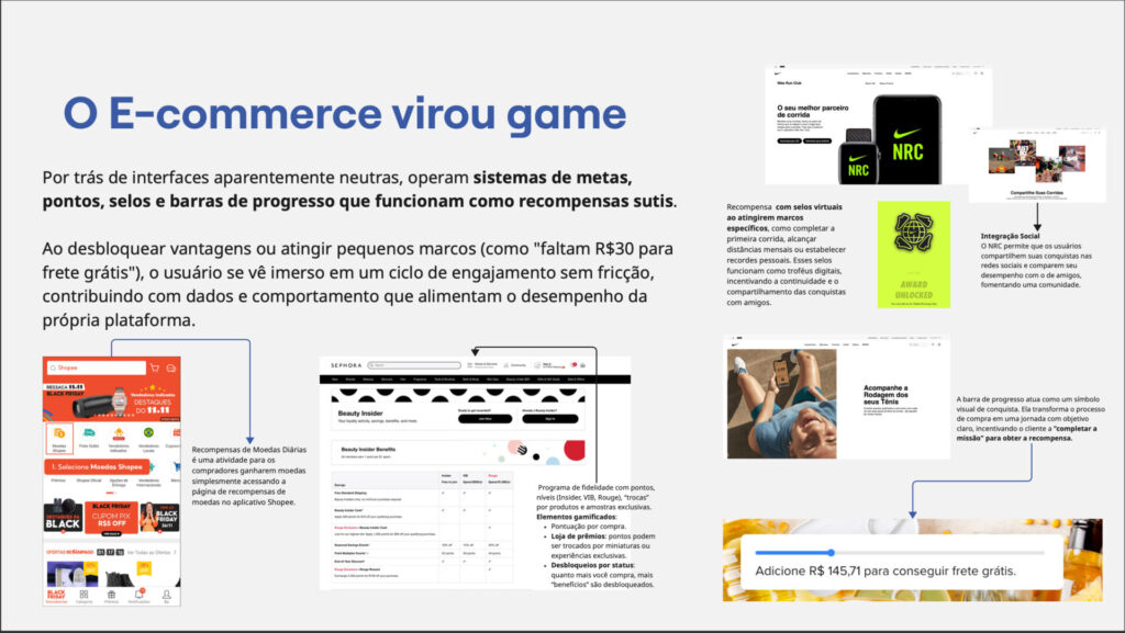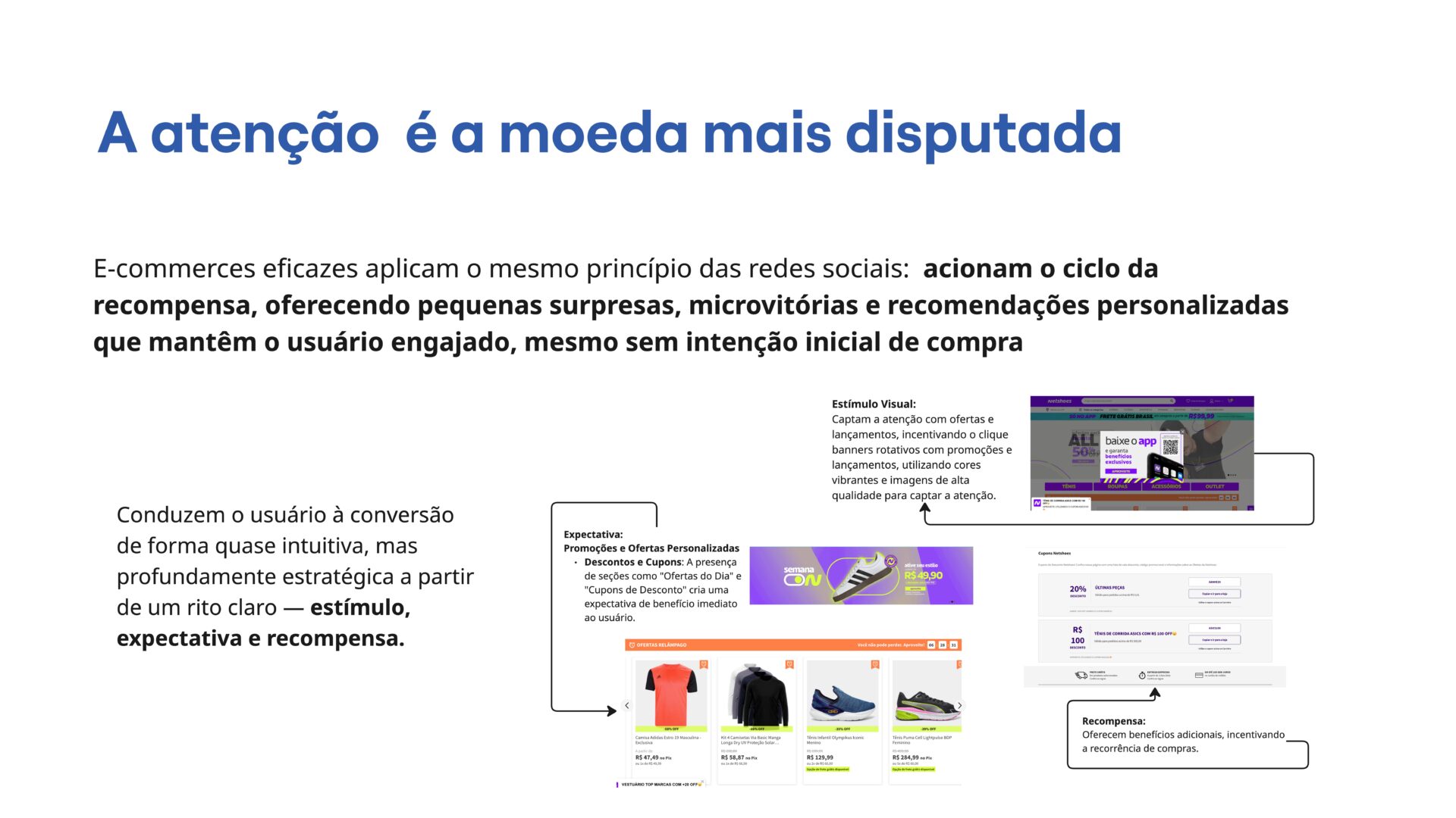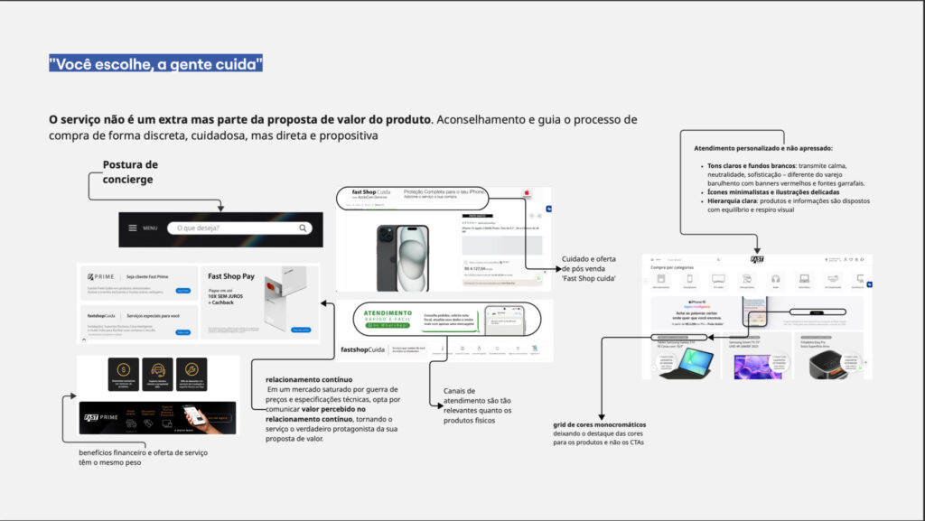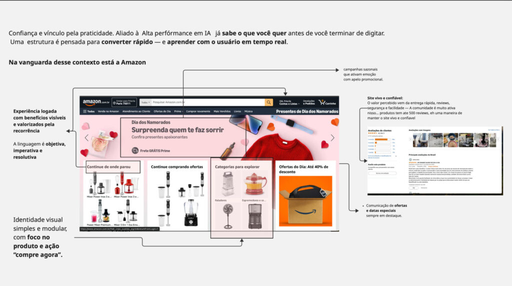 The study began with a broad reading of global and Brazilian e-commerce — analyzing how brands like Apple, Nike, Magalu, and Amazon build desire, loyalty, and conversion. We mapped three major retail territories: urgency retail, which compresses time and amplifies impulse; affinity retail, which pulses at the rhythm of communities; and depth retail, which welcomes, listens, and transforms. Each territory reveals a different way of building the relationship between brand and consumer.