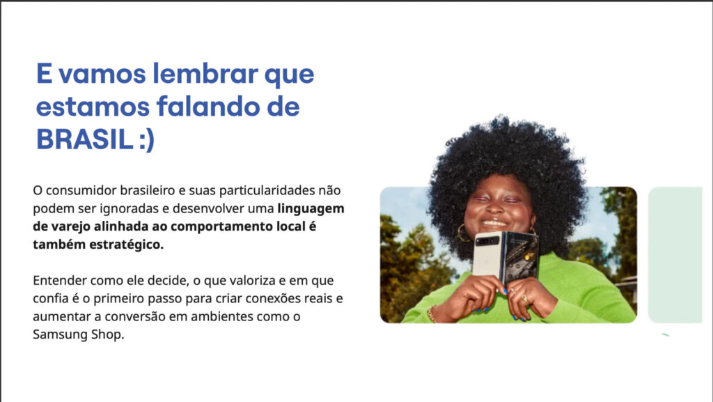 From that mapping, we turned our gaze to Samsung Shop — identifying the gaps between the current experience and contemporary digital shopper behavior. The result was a set of insights and creative territories guiding how the brand can make its language more human, its information hierarchy clearer, and its shopping journey more engaging — converting well, generating loyalty, and building desire all at once.
