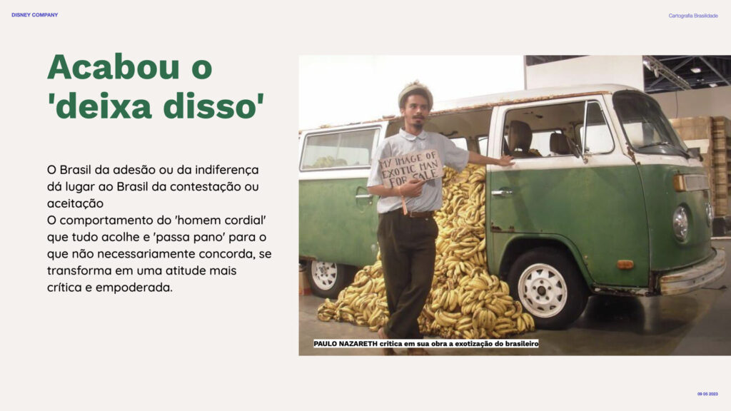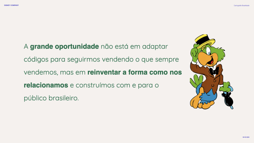 Fomos convidados pela equipe de Design de Experiência da Disney com um desafio estratégico: como gerar mais valor para os brasileiros nas experiências de marca e parcerias? A partir dessa provocação, conduzimos — em parceria com a Saga Inovation — uma cartografia profunda sobre o que define a brasilidade hoje e como se conectar de forma mais genuína com a cultura contemporânea do país.