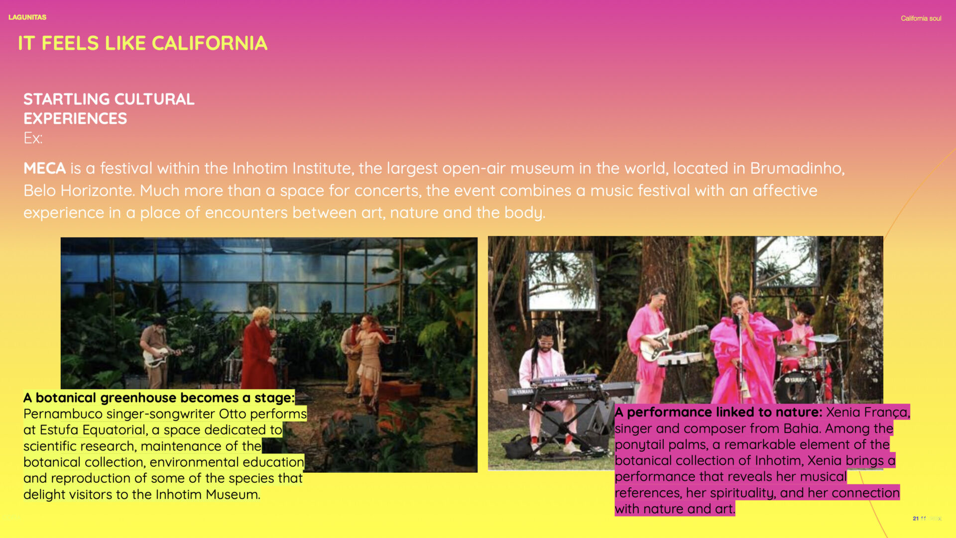 Evoluímos a entrega com sugestões de como traduzir essa atmosfera no contexto brasileiro, identificando iniciativas e criadores locais que conseguem incorporar esse espírito de forma autêntica.