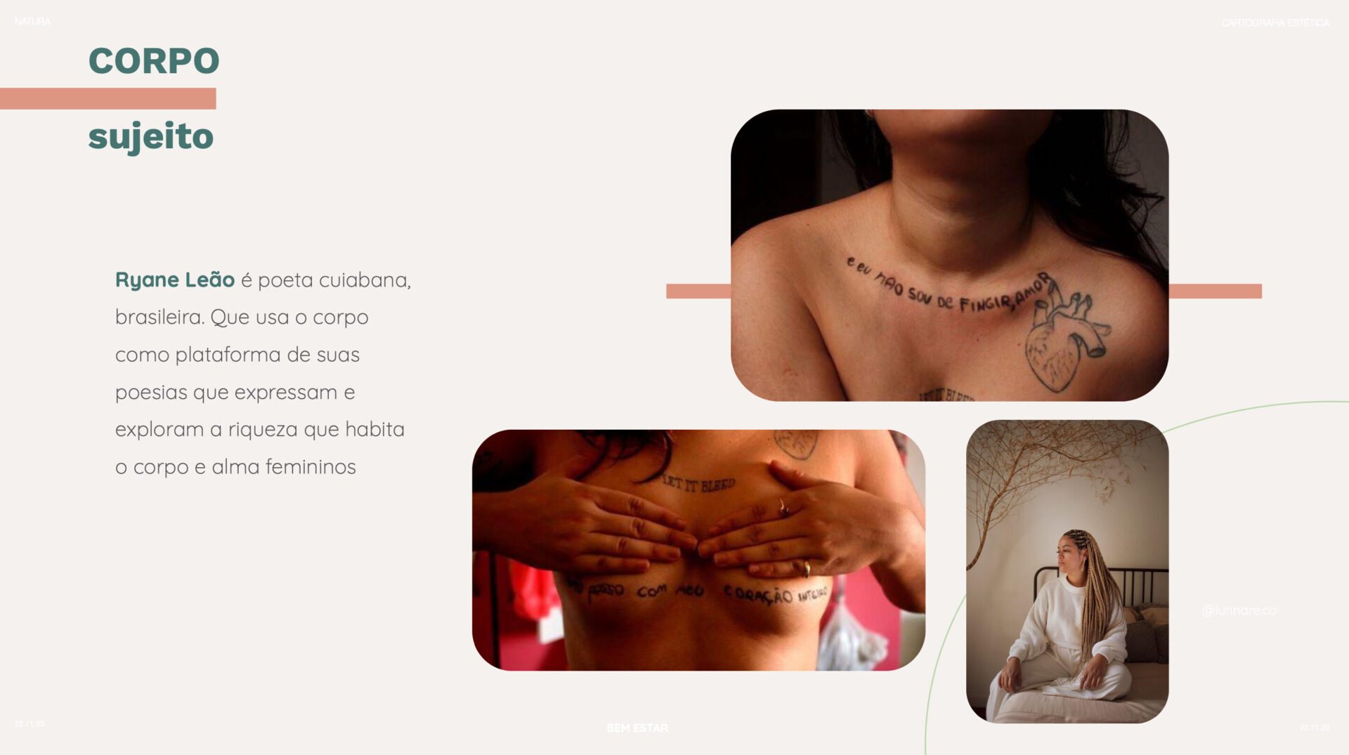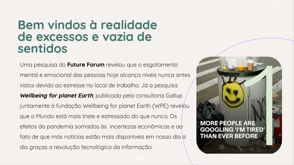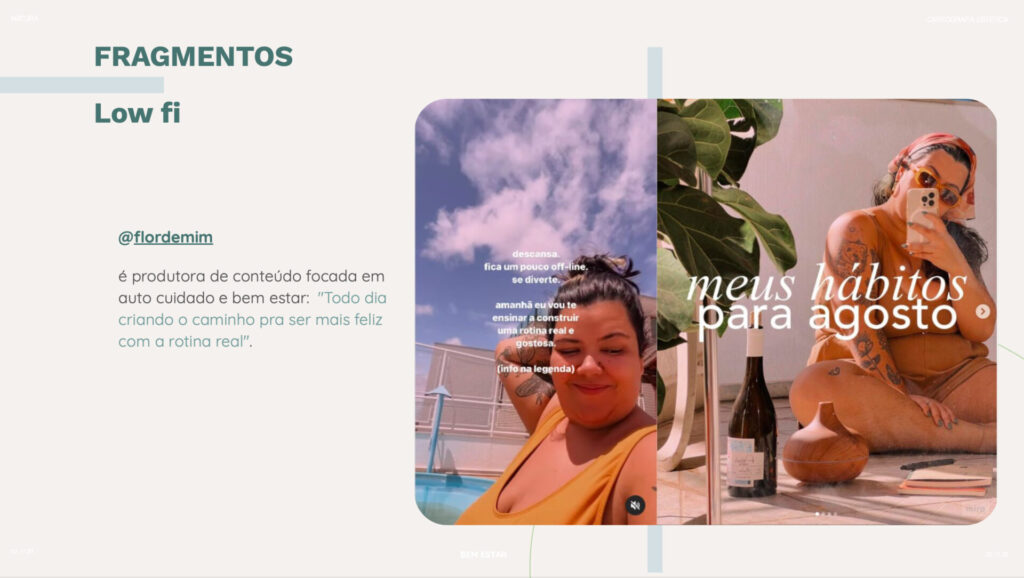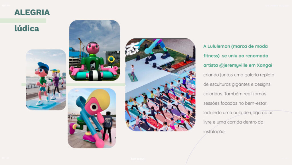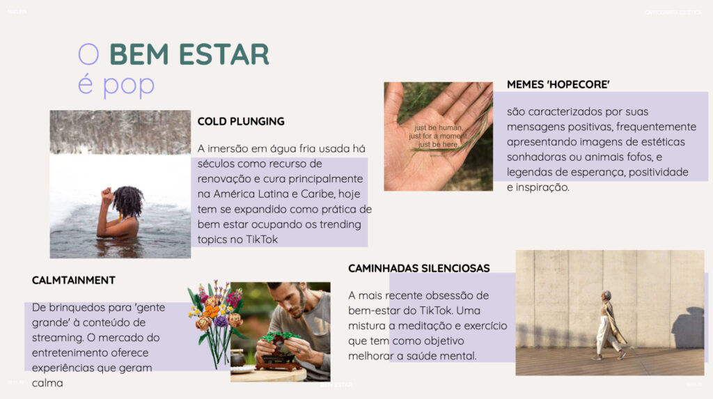 A cartografia estética para Natura mergulhou nas novas formas de viver e expressar o bem-estar. O trabalho trouxe uma leitura atualizada sobre como esse tema se manifesta na cultura hoje, sugerindo caminhos de criação para experiências, conteúdos e parcerias, além de ajudar na definição de territórios de expressão para as marcas do portfólio.